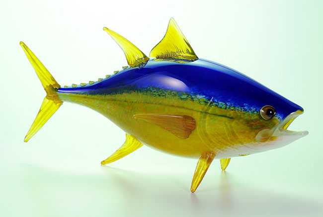 … Michael has long been recognized for his uniquely colored octopus. As his skills increase, so has his portfolio. Quickly gaining in popularity are the Salt Water Fish, such as the Yellow and Blue Fin Tuna, Mahi Mahi and Great White Sharks. Michael gains his creative energy from his family, friends and many interests. He is driven by the desire to dedicate his life mastering a personal interpretation of nature recreated and preserved in glass. Michael Hopko continues to aspire to new heights. You can look forward to many more amazing aquatic blown glass art sculptures from this finely skilled artist. Hopko Art Glass is located in the Trinity Alps of Northern California. Artist Michael Hopko has created a collection of hand-blown sculptures combining art and craftsmanship. The beauty and motion of nature are captured through glass in stunning detail.